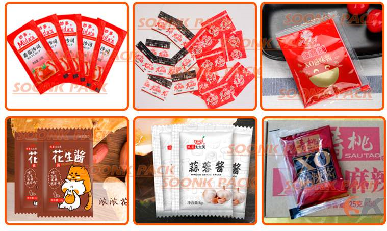 小型酱料自动包装机_肉酱番茄酱自动定量灌装设备_酱料包装机包装袋型展示
