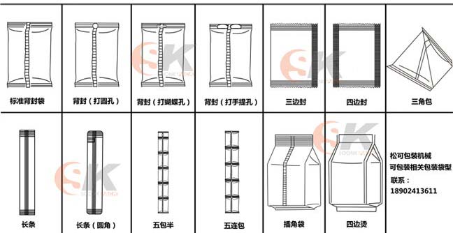 SK-L720立式自动颗粒包装机可以包装的袋型有标准背封、插角袋等袋型,可以加装打孔装置、手提孔装置等。