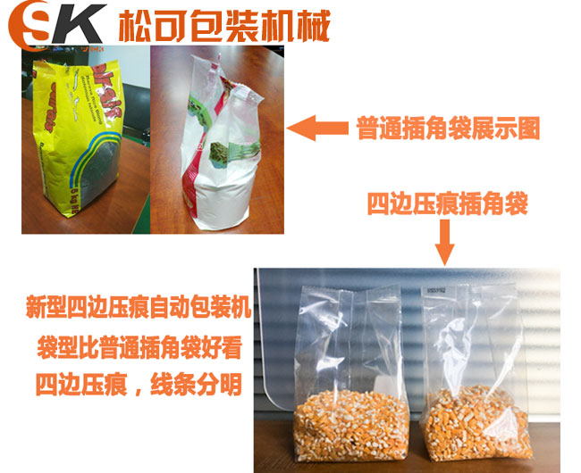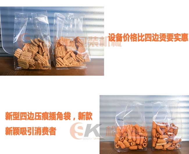 四边压边插角袋包装机又称为四边压痕插角袋包装机,主要针对插脚袋装产品的包装,这款新款四边压边插角袋包装机新颖的袋型,完美的四边线条,吸引消费者的目光。四边压边插角袋包装机又称为四边压痕插角袋包装机价格一般在几万到十几万不等。获取优惠及试包资格请联系在线客服或致电400-8433-188,