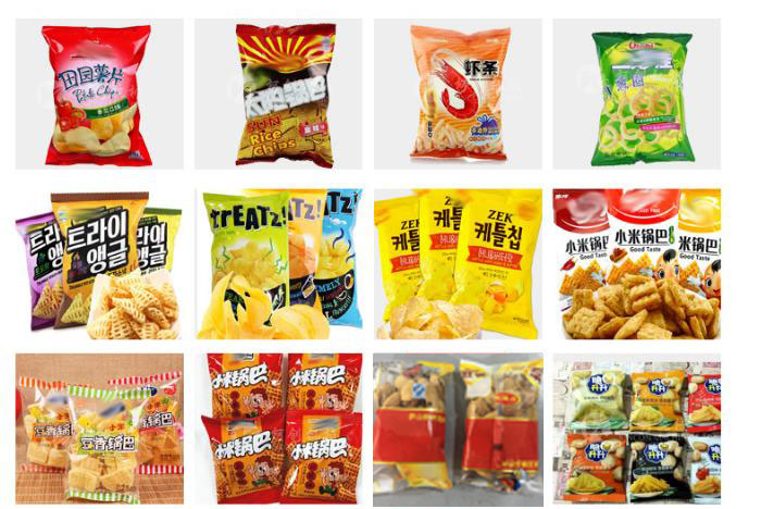 包装范围在1000ml 以内的产品,适合不规则,计量精度高及容易碎的散状物品包装中,如:膨化食品、虾条、薯片、香蕉片、苹果片、锅巴、饼干、花生、瓜子、糖果等:
